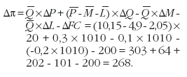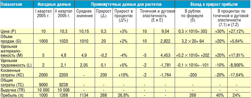 Таблица 1. Пример расчета вклада факторов прибыли в общую прибыль по упрощенной однопродуктовой модели