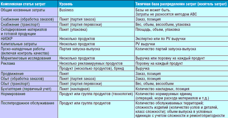 разнесена на продукты с помощью метода АВС. Вот некоторые статьи таких затрат: