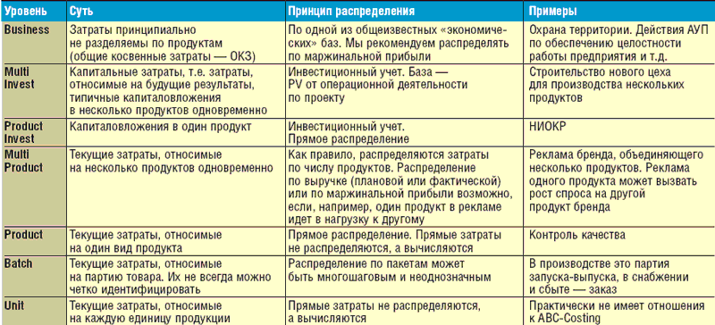8. Уровни распределения затрат на продукты. Многопродуктовые затраты делятся на инвестиционные (этот уровень мы называем Multi Invest) и текущие (Multi Product). Их разделение обосновано тем, что у них разные принципы разнесения на продукты и разные носители затрат (см. табл. 1. и [4]).