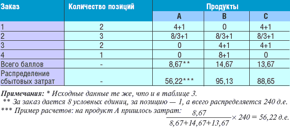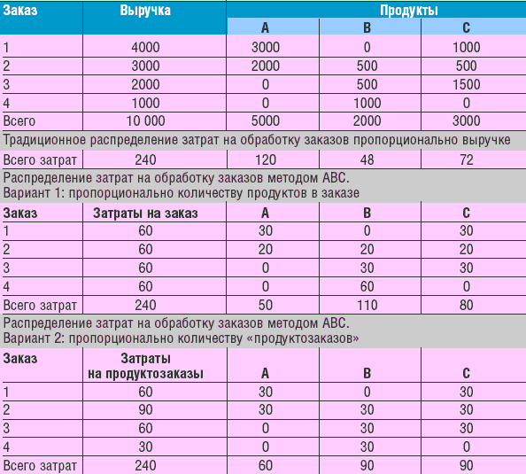 Таблица 3. Пример распределения затрат на обработку сбытовых заказов традиционным методом и двумя способами методом АВС.