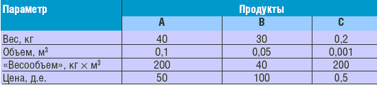 данные по весу, объему и цене грузов, а также вычислен условный показатель "весообъем".