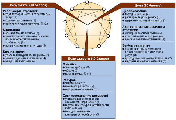Для компаний, оперирующих на рынке оценки, блоки "Цели" и "результаты" представляют равную ценность - 30 баллов. Это объясняется тем, что, работая в этой сфере, компании должны хорошо ориентироваться в предпочтениях клиентов и достаточно быстро изменять линейку своих услуг в случае необходимости. Доведение начатых преобразований до конца и четкое проведение избранной политики также является залогом успеха на этом рынке. Реализация всех проектов невозможна без наличия немалых финансовых ресурсов, находящихся как в обороте, так и в резерве - 40 баллов.