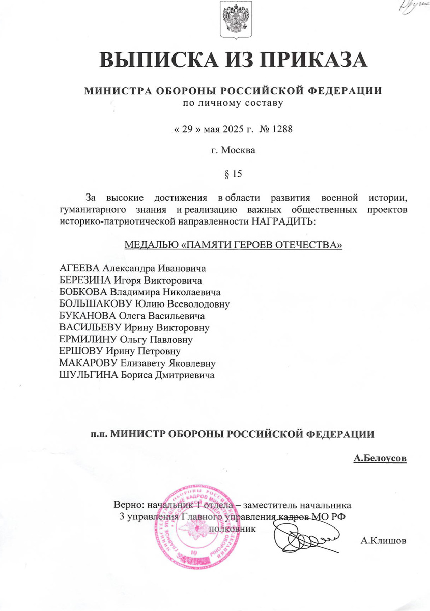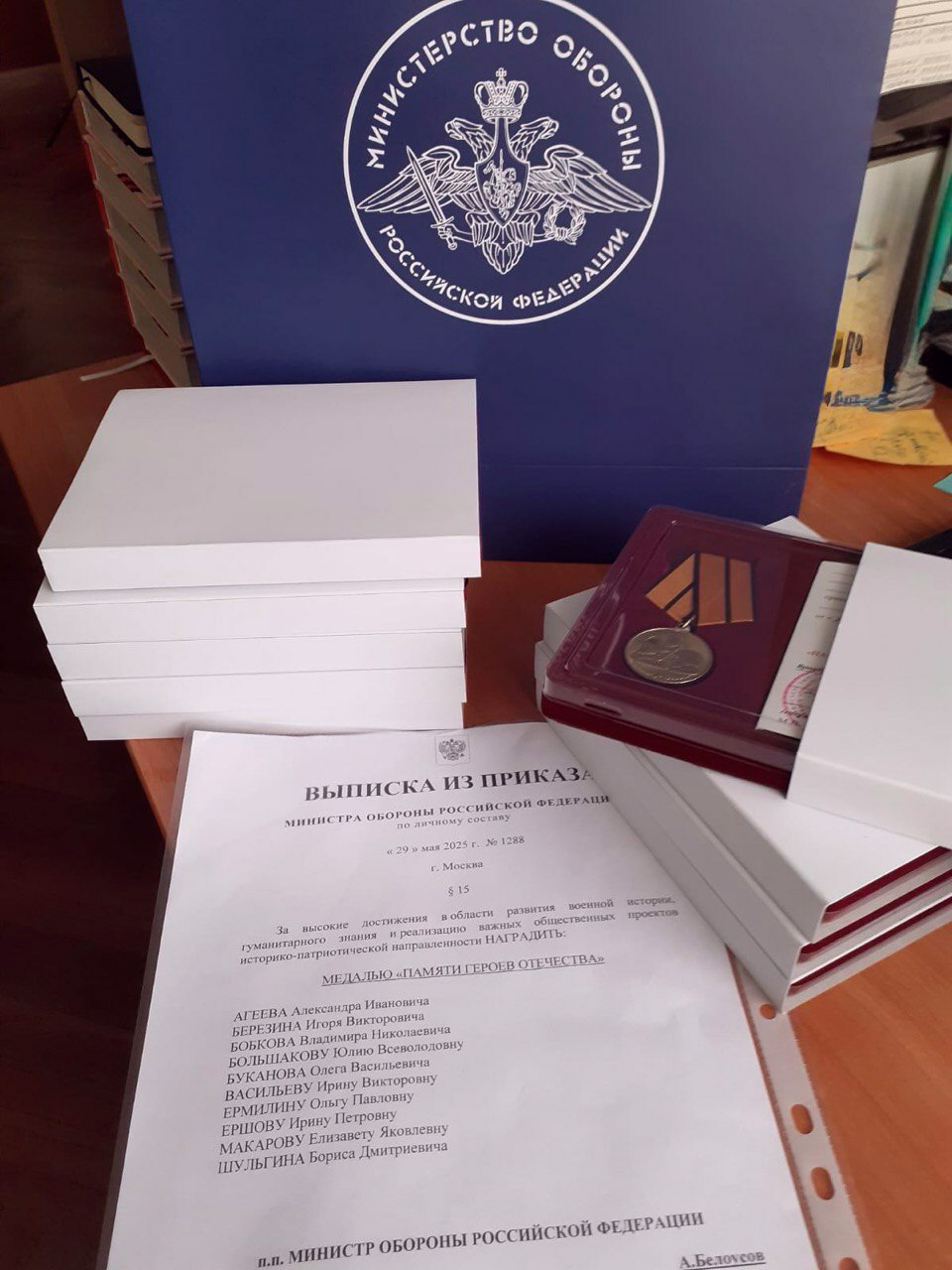 В приказе министра обороны РФ А. Белоусова от 29 мая 2025 г. говорится: «За высокие достижения в области развития военной истории, гуманитарного знания и реализацию важных общественных проектов историко-патриотической направленности наградить медалью «Памяти героев Отечества»: