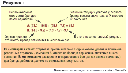 Роль нематериальных активов в современном бизнесе диктует маркетологам необходимость усовершенствования методики оценки марочного капитала; иначе в дело вмешаются финансисты, которые рассматривают маркетинг и вложения в бренд как вынужденные расходы. А их позиция по сокращению инвестиций в развитие бренда необратимо приведет к потере прибыли на долгосрочную перспективу. В представленной схеме дано сравнение двух компаний, работающих на российском рынке пива.
