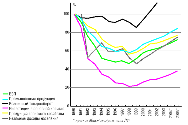 График 2. Динамика макроэкономических показателей России (1990 год =100%)