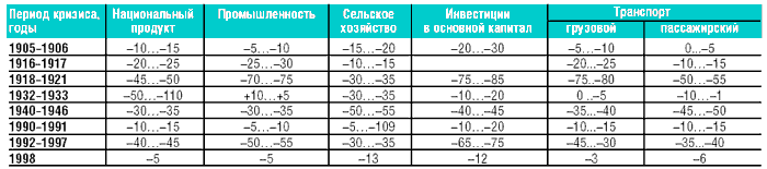Интересное исследование экономических кризисов в нашей стране недавно опубликовал Андрей Полетаев (8). В ушедшем столетии он насчитал семь кризисных спадов в отечественной экономике; к ним можно добавить восьмой – в результате дефолта 1998 года. Наибольшей глубиной, по его оценке, отличались кризисы 1918-1921 годов, когда национальный продукт сократился на 45-50%; 1940-1946 годов – произошло сокращение на 30-35%; 1992-1997 годов – привел к сокращению на 40-45% (см. таблицу 1). Правда, трудно согласиться с оценкой Андрея Полетаева, что все это – кризисы государственной политики (8. С. 226), в действительности их причины многообразны. Но факт остается фактом: "достижения" России по глубине экономических кризисов в военное время (1918-1920) и в мирное время (1991-1998) можно вносить в книгу рекордов Гиннеса.
