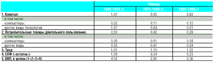 Это и приводит к резкому падению роли и значения синергетических эффектов совместно-кооперативного действия экономических интересов факторов труда и капитала в долгосрочном экономическом росте и, соответственно, усилению действия системы противоположных, или, выражаясь языком политэкономии XIX века, антагонистических интересов. В конце ХХ века американские экономисты Дейл Йоргенсен, специализирующийся на оценках темпов и факторов экономического роста США, и Кеин Стирох опубликовали свои расчеты вклада различных факторов в темпы роста американской экономики в период с 1948 по 1996 год (см. таблицу 1).