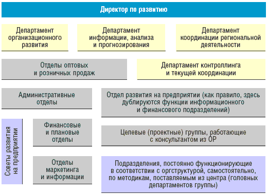 Многие крупные компании с головным офисом в Москве идут по пути создания внутренних отделов развития, приглашая консультантов извне, выводя в отдельные подразделения так называемые «инновационные двигатели» (как правило, это «личная гвардия» главного совладельца либо некое подобие «всевидящего ока»). Иногда на службу развития возлагают функции гуру, а чаще всего просто сваливают все, чем не могут или не хотят заниматься другие. При таком отношении, не имея четкого структурного и функционального устройства, любая служба спасует перед «мушкетерами» – традиционными структурами, многие годы использовавшимися для управления производством.