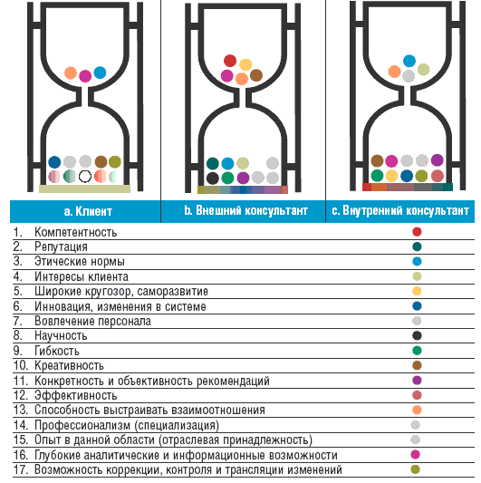 А теперь предлагаю совместить картинки друг с другом в разных вариантах, убрав накопители (нижний ограничитель). Если, совмещая 2.a и 2.b рисунки, заменить верхнюю колбу клиентских часов нижней консалтинговой, получатся трехъярусные часы (рис. 3): мы получим картину, из которой явственно видно, что пожелания клиента (нижняя колба) не совпадают по изначальным своим характеристикам с теми услугами, которые может предоставить консультант (совмещенное содержимое верхней колбы клиента и нижней колбы внешних консультантов), то есть консультант ждет от клиента той информации, которую клиент ждет от консультанта. Таким образом, те работы, которые выполнит внешний консультант, частично удовлетворяют клиента, но не полностью соответствуют его ожиданиям.