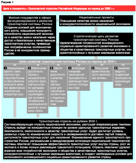 В "Транспортной стратегии Российской Федерации на период до 2030 г." особо отмечается не только необходимость формирования единого транспортного пространства России, но и стратегическая значимость транспорта как средства региональной и международной интеграции, продвижения российских национальных интересов по всему миру (рис. 1). Т.е. речь идет не только об обеспечении эффективности транспортных услуг внутри страны, но и о более полной реализации транзитного потенциала России.