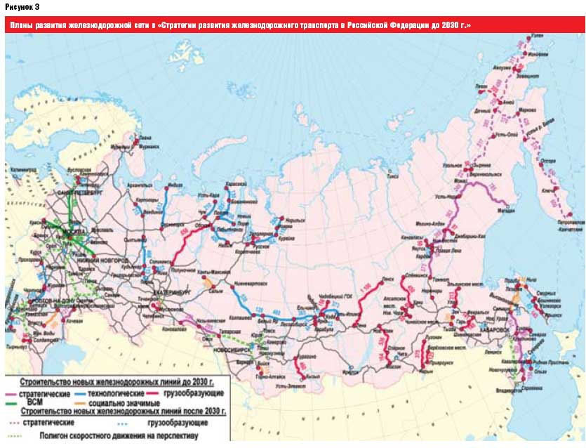 В этой связи важно отметить, что одним из ключевых событий стало одобрение Правительством РФ "Стратегии развития железнодорожного транспорта в Российской Федерации до 2030 г.", реализация которой должна обеспечить рост экономики страны по сценарию инновационного развития. Предстоит построить тысячи километров новых железнодорожных линий, модернизировать уже существующие магистрали (рис. 3). Все это должно, по планам руководства страны, укрепить конкурентоспособность и геополитические позиции России, придать мощный импульс социально-экономическому подъему страны.