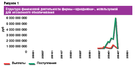 Наиболее информативные данные – это сведения о размерах выплат и поступлений и период деятельности компании. Дополнительными сведениями, необходимыми для более полного анализа деятельности компании, являются данные о численности сотрудников, количестве счетов, как самой фирмы, так и ее контрагентов. Наиболее распространенным типом фирм-"однодневок" являлись организации со значительным превышением объема поступлений над выплатами, период их деятельности обычно не превышал 12 месяцев, официальные сотрудники отсутствовали. Подобный тип "однодневок" используется в основном в операциях незаконного обналичивания (см. рис. 1).
