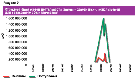 Следующий установленный тип финансовой деятельности фирмы-"однодневки" связан со значительным превышением размера выплаченных безналичных денежных средств над поступившими. Так же как и в предыдущем случае, подобные организации в среднем ведут финансовую деятельность не дольше 12 месяцев, официальный персонал отсутствует. Основной смысл деятельности такого типа "однодневок" состоит в проведении операции обезналичивания. Подобные противоправные схемы используют главным образом торговые организации, имеющие значительные объемы неучтенных наличных денежных средств, а также предприятия, производящие неучтенную продукцию, за которую их контрагенты расплачиваются наличными деньгами (см. рис. 2).