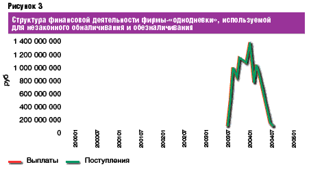 Еще один тип фирмы-"однодневки" – "сбалансированный", характеризующийся сопоставимым объемом выплат и поступлений. Он получает все большее распространение, поскольку позволяет замыкать потоки безналичных и неучтенных наличных денежных средств, избавляя тем самым недобросовестный банк, обслуживающий расчетный счет подобной организации, от необходимости получения значительных наличных денежных средств в РКЦ (см. рис. 3). Так же как и в предыдущих случаях, персонал отсутствует, деятельность фирмы может длиться до двух лет. Подобные "однодневки" используются, как правило, хозяйствующими субъектами для незаконных операций как обналичивания, так и обезналичивания.