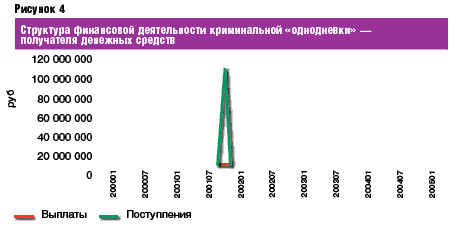 Помимо вышеописанных разновидностей фирм, используемых хозяйствующими субъектами с целью незаконной минимизации налогообложения, установлено несколько типов фирм-"однодневок", чьи финансовые трансакции имеют признаки откровенно криминальной деятельности. Операции подобных "однодневок" характеризуются малой продолжительностью и абсолютным превалированием одного вида финансовых трансакций над другим (выплат над поступлениями либо наоборот). Типичной особенностью таких фирм является малое число контрагентов и более короткий срок существования. Деятельность "однодневок" данного типа часто сводилась к проведению единственного платежа – по поступлениям либо выплатам. Очевидно, что подобная структура финансовых трансакций с высокой степенью вероятности связана с откровенно криминальными действиями, такими как хищение либо легализация преступных капиталов, финансирование НВФ и т.п. (см. рис. 4). "Однодневки" подобного типа могут быть как получателями, так и плательщиками безналичных денежных средств. Данный тип "однодневки" может быть использован и для транзитных операций, в таком случае сумма полученных и выплаченных безналичных денежных средств практически полностью совпадает. Помимо "однодневок" использование экспертно-аналитического комплекса "Ариадна" позволяет выявлять "буферные" фирмы по характерным для них параметрам финансовой деятельности.
