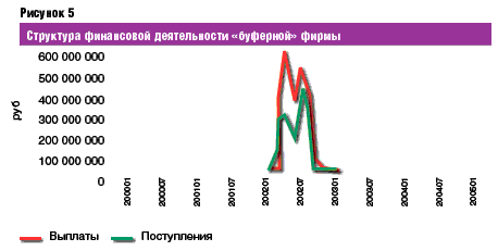 Так же как и в случае "однодневок", ключевыми для определения "буферных" фирм являются следующие показатели: объем поступивших и выплаченных безналичных денежных средств, длительность финансовой деятельности организации, количество счетов контрагентов, число официальных сотрудников. В отличие от "однодневок" в случае "буферных" фирм для выявления реального выгодополучателя часто требовался более детальный анализ финансовой деятельности. В результате исследования выяснилось, что характерной особенностью деятельности "буферной" фирмы является небольшое число контрагентов, более длительный период деятельности и в ряде случаев – наличие малого штата сотрудников. Объемы и соотношения выплат и поступлений могут варьироваться в широком диапазоне в зависимости от используемой финансовой схемы (см. рис. 5). Необходимо отметить, что в отличие от "однодневки" обнаружение "буферной" фирмы связано с определенными трудностями, в связи с чем необходимо подчеркнуть принципиальные отличия деятельности подобной организации от деятельности реального хозяйствующего субъекта. Первое – число сотрудников "буферной" фирмы (обычно до пяти человек) не сопоставимо с объемами ее финансовой деятельности (от сотен миллионов до нескольких миллиардов рублей), второе – число контрагентов подобной организации (обычно несколько десятков) также не сопоставимо с финансовыми оборотами. Дополнительное изучение финансовой деятельности и контрагентских отношений показывает, что организация не ведет осмысленной экономической деятельности.