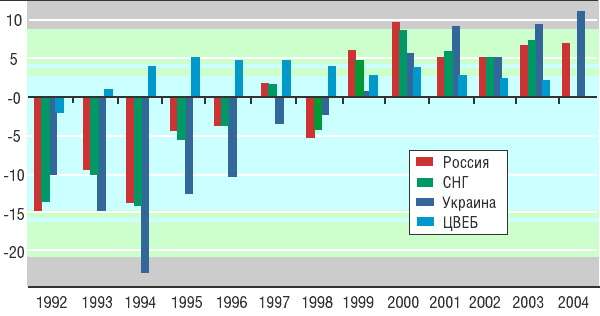Как видно из показанной гистограммы, несмотря на наблюдаемую последние годы устойчивую позитивную динамику, даже теперь, спустя 13 лет, ни Россия, ни Украина еще не оправились до конца от последствий распада СССР. Спад в динамике индекса роста ВВП в Украине оказался более глубоким, чем в России. Однако темпы роста украинской экономики в последние годы не только опережали российские, но были выше, чем в странах СНГ в целом или в странах Центральной и Восточной Европы, включая страны Балтии (рис. 2).