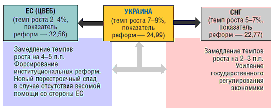 От стратегического вектора интеграции будет во многом зависеть также институциональная динамика движения Украины по пути реформ. В случае выбора восточного направления, на котором Украина опережает многие страны СНГ по интегральному показателю рыночных реформ, изменения в темпах проводимых реформ будут не столь уж значительными. Можно лишь ожидать определенного усиления государственного регулирования синхронно с другими странами – участницами СНГ.