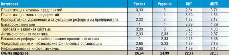Еще один интересный эмпирический показатель – это институциональная динамика движения по пути реформ после распада бывшего СССР, рассчитанная по методике ЕБРР (табл. 1). По этому интегральному показателю Россия немного опережает Украину. Оба государства находятся впереди СНГ как единого целого, но заметно отстают от ЦВЕБ.
