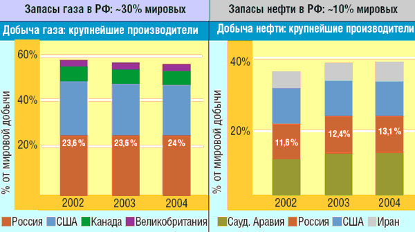 Развитие нефтегазового сектора на постсоветском пространстве отличается существенным динамизмом. В Казахстане, Узбекистане и Азербайджане прямых инвестиций в НГС на тонну добычи и на душу населения больше, чем у нас. В 1991 г. Россия добыла 643 млрд м3 газа, в 2004 г. – 634 млрд м3; Казахстан добывал 8 млрд м3, а сейчас – 20 млрд; Узбекистан – соответственно 42 и 60 млрд м3.